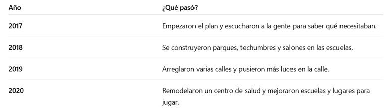 Porque ahora los niños ahora tienen lugares más seguros para estudiar y jugar. Además, las calles están más fáciles de transitar y con más luz. La salud de todos mejoró con centros de salud más bonitos y funcionales.